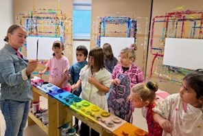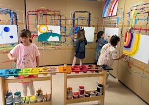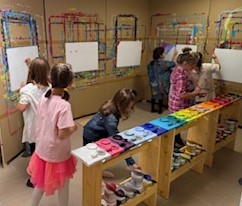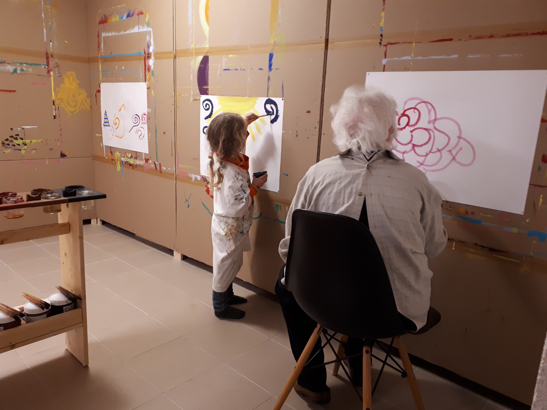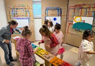 Beim Malen mit kleineren Kindern (Kindergartenalter) fällt zumeist mehr Aufwand an (je kleiner/unerfahrener die Kinder, desto mehr Arbeit fällt an für das Zeigen der richtigen Handhabung mit dem Material, Aufwischen von Farbtropfen, Blätter Auf- und Abängen, etc.). Deshalb werde ich, je nach Alter und Anzahl der Kinder, 1-2 begleitende Erwachsene im MalRAUM erbitten, die den Kindern unter meiner Anleitung assistieren.